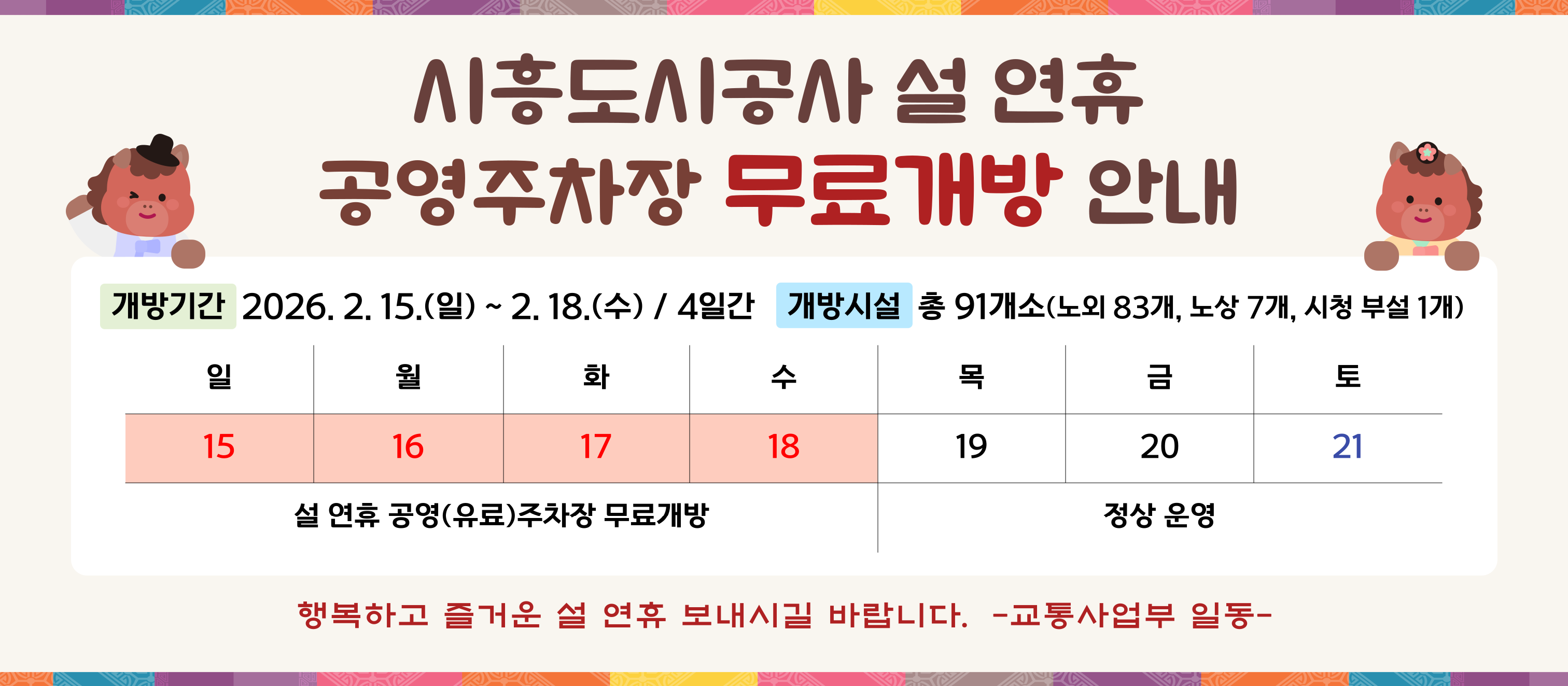 안녕하세요 시흥도시공사 교통사업1, 2부 입니다. 설날을 맞이하여 시흥시 공영주차장 무료개방을 진행하오니 이용에 참고 부탁드립니다. ...