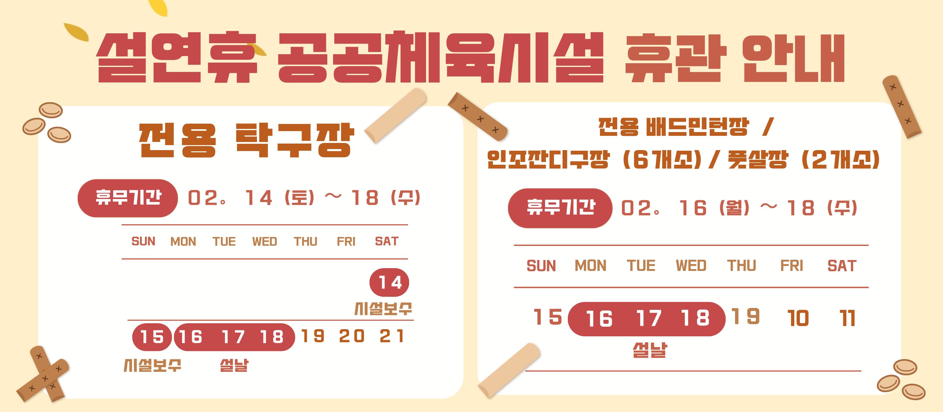 2026-02-09안녕하세요⭐ ⭐ 공공체육시설 휴관 안내드립니다. ⭐ 전용탁구장 : 2월 14일(토) ~ 18일(수) ⇒ 1...