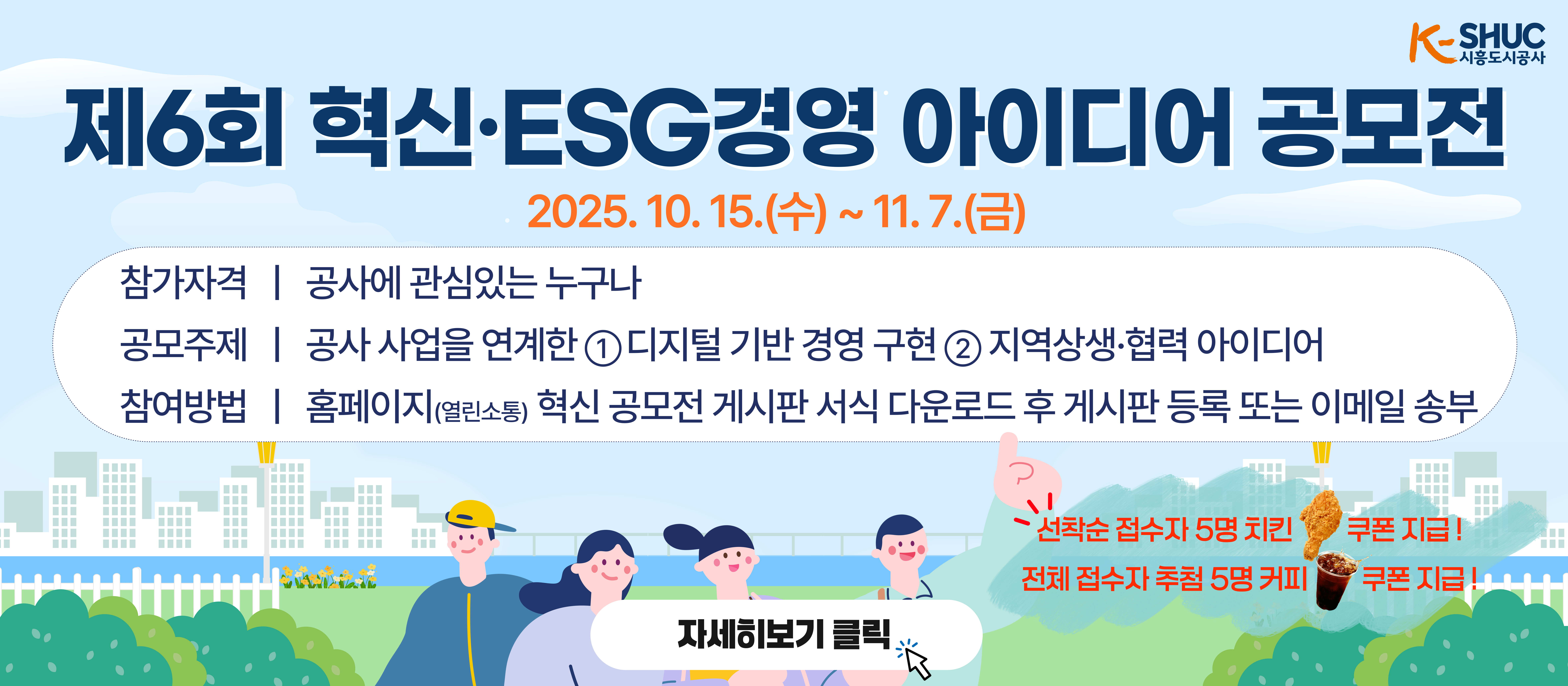 고시/공고 2025-11-03 시흥도시공사 청렴시민감사관 모집 공고 2025-10-31 시흥도시공사 투자심의위원회 위원 선정결과 공고 2025-10-30 e편한세상 시흥장현 퍼스트베뉴(시흥장현 B10BL) 무순위(사후) 입주자모집공고 2025-10-24 「시흥도시공사 민간 제안 개발사업 공모」 공고 2025-10-14 제6회 시흥도시공사 혁신ㆍESG경영 아이디어 공모
