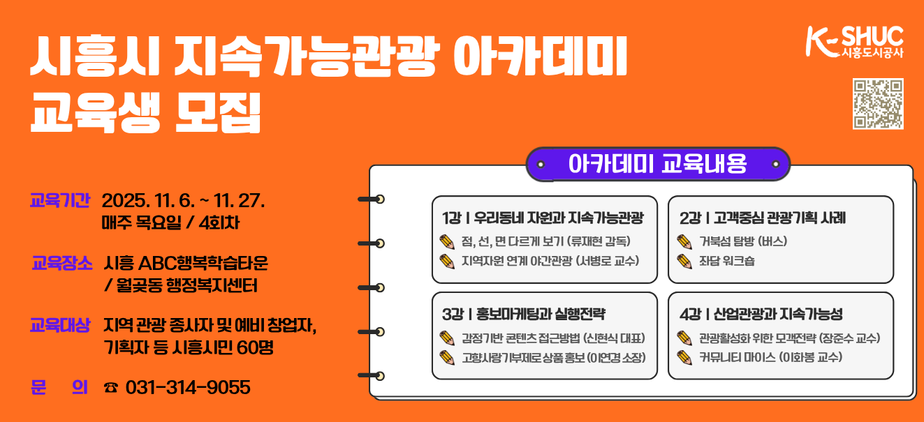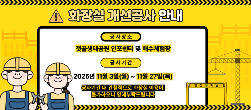 새소식 2025-10-29 🌊 무료_바다를 닮은 오다카요가 🌊 해양치유 프로그램 2025-10-29 ❤️(무료)시흥시 지속가능관광 아카데미 교육생 모집❤️ 2025-10-02 [추석 인사말] 풍요로운 한가위 보내세요! 2025-06-09 갯골생태공원 내 방치 자전거 처분 안내 2025-01-23 🥕 시흥도시공사 소식을 '당근'에서 만나보세요 🥕